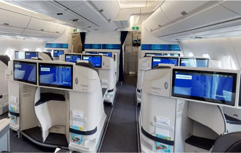 Bagages rangés, il est temps de prendre possession de son siège. La nouvelle « Madras », légèrement différente de la configuration proposée sur l’A330, dispose de sièges dont l’assise de 48 cm et l’espacement de 155 cm entre les rangées assure un réel confort. Cet espace de 155 cm trouve son allonge sous la coque du siège de devant, permettant, en mode nuit, de profiter d’un lit complet. Un large coussin permet de peaufiner l’assise. Là, le passager dispose d’un écran de 43 cm, installé sur le dos de la coque située devant, avec télécommande située sur le côté. Bien entendu, le siège bénéficie de multiples réglages électriques. Une tablette, pour la presse numérique, est distribuée à la demande.