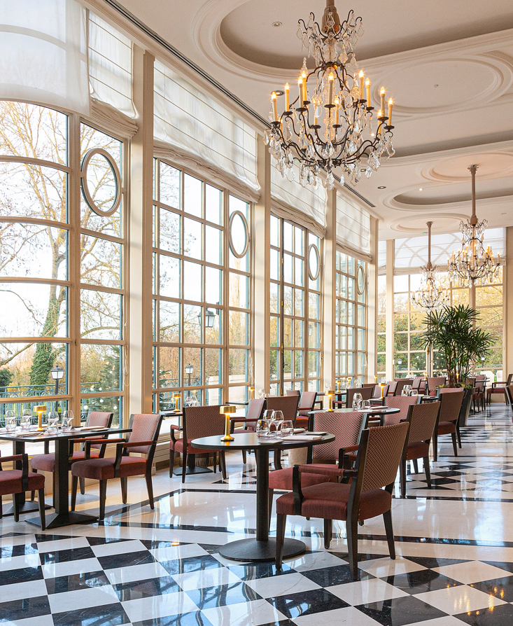 Côté parc, une grande véranda abrite deux restaurants : l’étoilé de Gordon Ramsay à gauche, et la brasserie bien nommée Véranda à droite. La salle, somptueuse, décorée chaleureusement par Fiona Thompson, est baignée de lumière grâce à la façade entièrement vitrée ouvrant, aux beaux jours, sur une terrasse ombragée. De là, la vue s’ouvre sur les grands prés du domaine royal qui abritent les plus beaux chevaux de l’Académie équestre.